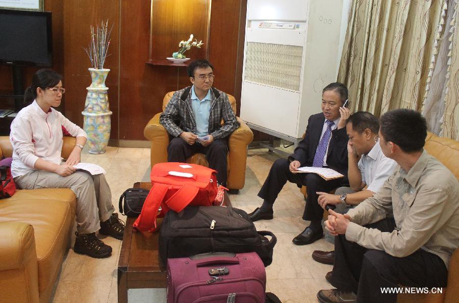 Three Chinese disease control experts arrive at the airport of Conakry, capital of Guinea, Aug. 11, 2014. The National Health and Family Planning Commission (NHFPC) announced on Saturday that China would send three expert teams and medical supplies to Guinea, Liberia and Sierra Leone to assist the prevention and control of the Ebola virus. (Xinhua/Cellou) |