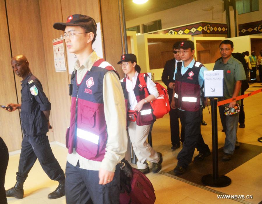 Three Chinese disease control experts arrive at the airport of Conakry, capital of Guinea, Aug. 11, 2014. The National Health and Family Planning Commission (NHFPC) announced on Saturday that China would send three expert teams and medical supplies to Guinea, Liberia and Sierra Leone to assist the prevention and control of the Ebola virus. (Xinhua/Cellou)