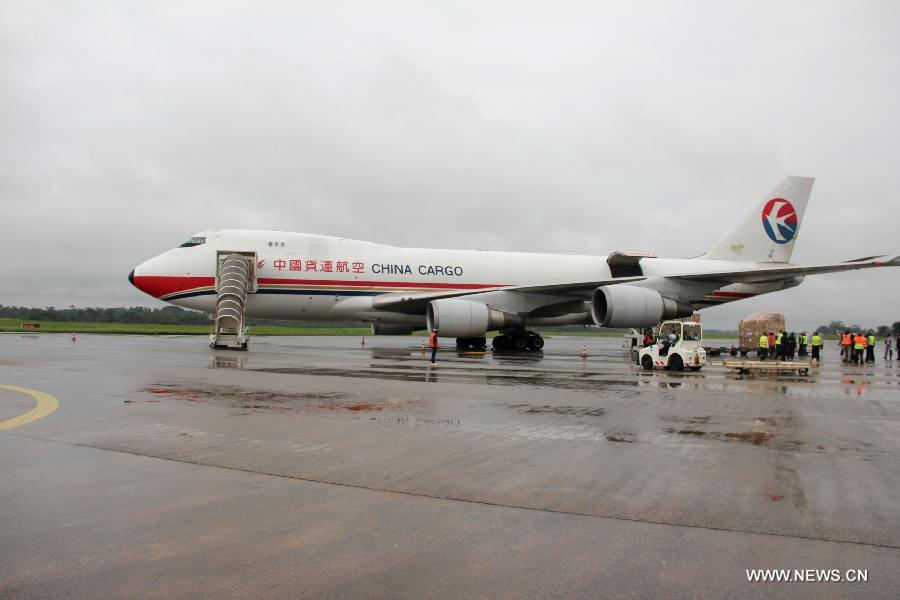 A Chinese plane carrying emergency humanitarian supplies for Sierra Leon arrives at the airport in Freetown, capital of Sierra Leone, on Aug. 11, 2014. A Chinese plane carrying emergency humanitarian supplies for Sierra Leone arrived in the country's capital Freetown on Monday afternoon, as part of effort to help the country contain the spread of Ebola. (Xinhua) |