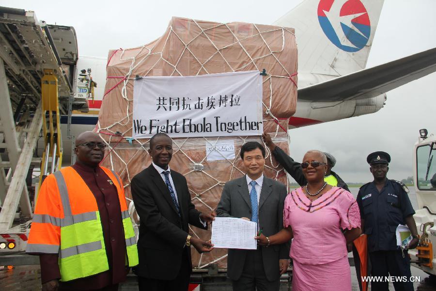 Chinese Ambassador to Sierra Leone Zhao Yanbo (2nd R, front), Deputy Minster of Foreign Affairs of Sierra Leone Ebun Strasser-King (1st R, front) and Sierra Leone's Deputy Minister of Health Abu Bakar Fofanah (2nd L) attend a transferring ceremony of emergency humanitarian supplies provided by China at the airport in Freetown, capital of Sierra Leone, Aug. 11, 2014. A Chinese plane carrying emergency humanitarian supplies for Sierra Leone arrived in the country's capital Freetown on Monday afternoon, as part of effort to help the country contain the spread of Ebola. (Xinhua) |