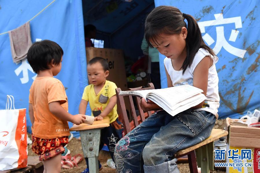Luo Hongxia(right), a nine-year-old girl, is reading her book in front of the tent of the temporary settlement in Longtoushan Town.(Xinhua/Tao Liang)