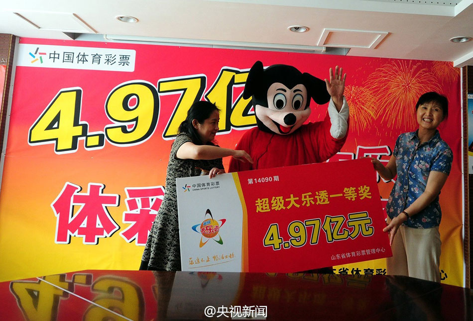 A man in Zibo, East China’s Shandong province, wins a lottery that is worth 497 million yuan on Aug. 4, 2014. The winner dressed in a Mickey Mouse costume comes to the Sports Lottery Center in Shandong to claim the prize and establish a “Well-doer Fund” with 20 million to help people in need. (Photo/ CCTV Microblog) |
