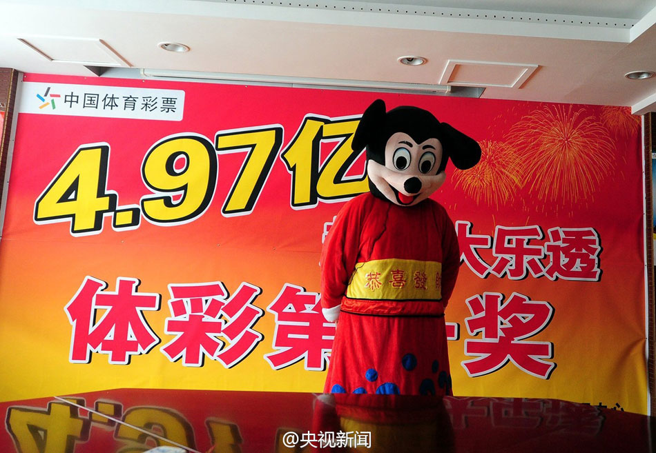 A man in Zibo, East China’s Shandong province, wins a lottery that is worth 497 million yuan on Aug. 4, 2014. The winner dressed in a Mickey Mouse costume comes to the Sports Lottery Center in Shandong to claim the prize and establish a “Well-doer Fund” with 20 million to help people in need. (Photo/ CCTV Microblog) |