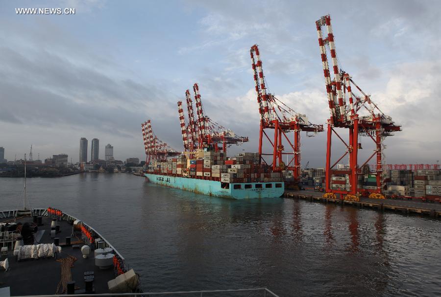 China's amphibious landing ship, the Changbaishan, sails into the Colombo Harbor in Comlombo, Sri Lanka, Aug. 12, 2014. China's amphibious landing ship Changbaishan and frigate Yuncheng of the 18th escort fleet of Chinese Navy arrived in Colombo of Sri Lanka on Tuesday. The two ships will stay here for one day before they resume their voyage to fulfill their mission in the Somali waters. (Xinhua/Zhang Yuelin)