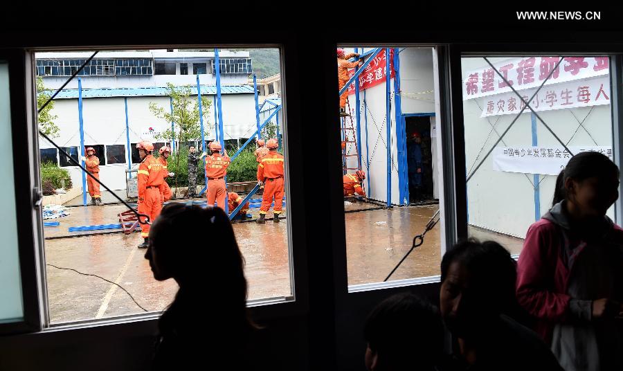 Children visit the newly-built Hope Primary School in Longtoushan Township in earthquake-hit Ludian County, southwest China's Yunnan Province, Aug. 12, 2014. The Hope Primary School, sponsored by China Youth Development Foundation and Yunnan Youth Development Foundation, is the first one built after the 6.5-magnitude earthquake. The school, which is able to accommodate more than 500 students, has 20 prefabricated rooms with each covering 56.8 square meters. A 6.5-magnitude earthquake hit Ludian of southwest China's Yunnan Province on Aug. 3, which claimed at least 617 lives and injured thousands of others. (Xinhua/Lin Yiguang) |