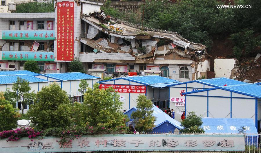 The newly-built Hope Primary School is seen before the old school which was damaged in the earthquake in Longtoushan Township of Ludian County, southwest China's Yunnan Province, Aug. 12, 2014. The Hope Primary School, sponsored by China Youth Development Foundation and Yunnan Youth Development Foundation, is the first one built after the 6.5-magnitude earthquake. The school, which is able to accommodate more than 500 students, has 20 prefabricated rooms with each covering 56.8 square meters. A 6.5-magnitude earthquake hit Ludian of southwest China's Yunnan Province on Aug. 3, which claimed at least 617 lives and injured thousands of others. (Xinhua/Pei Xin) |