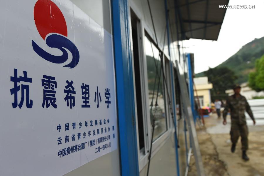 The first Hope Primary School built after a 6.5-magnitude earthquake is inaugurated in Longtoushan Township in earthquake-hit Ludian County, southwest China's Yunnan Province, Aug. 12, 2014. The Hope Primary School, sponsored by China Youth Development Foundation and Yunnan Youth Development Foundation, is the first one built after the 6.5-magnitude earthquake. The school, which is able to accommodate more than 500 students, has 20 prefabricated rooms with each covering 56.8 square meters. A 6.5-magnitude earthquake hit Ludian of southwest China's Yunnan Province on Aug. 3, which claimed at least 617 lives and injured thousands of others. (Xinhua/Lin Yiguang) |