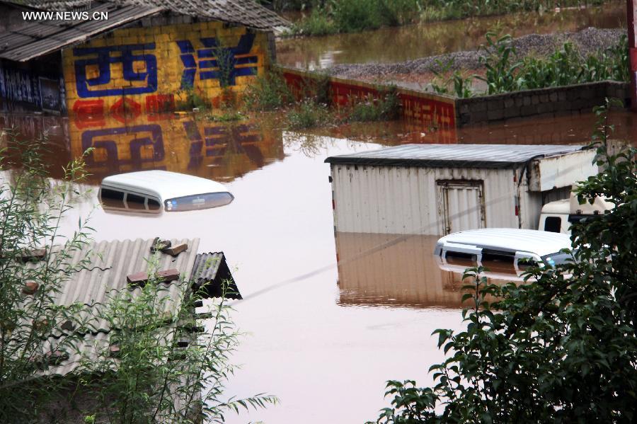 Photo taken on Aug. 12, 2014 shows the flooded Jieshang Village of Weining County, southwest China's Guizhou Province. The death toll from continuous rains in southwest China's Guizhou Province has increased to 12, with 12 still missing, local authorities said Tuesday. (Xinhua/Yue Gang) |