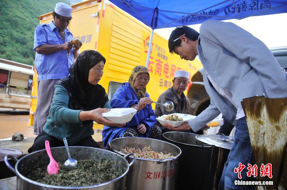 Ma Wufen, a 65-year-old ethnic Hui, called upon some 20 Muslim volunteers to distribute food and fruit to the victims and rescue workers in Ludian County, southwest China’s Yunnan Province on August 11, 2014. They prepared Muslim food for more than one thousand people and sent the food to Longtoushan Town, the epicenter of the Ludian earthquake. Starting from August 5, they’ve been spending more than 5,000 yuan every day on preparation of the relief food and all their money comes from donations by people of different ethnic groups such as the Muslim communities. (Chinanews.com/ Yang Kejia)