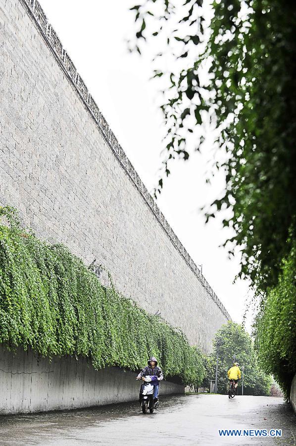 Citizens ride along the Ming Dynasty city wall on Aug. 13, 2014. The 2nd Summer Youth Olympic Games will kiss off on August 16 in Nanjing, capital of east China's Jiangsu Province. (Xinhua/Yue Yuewei)