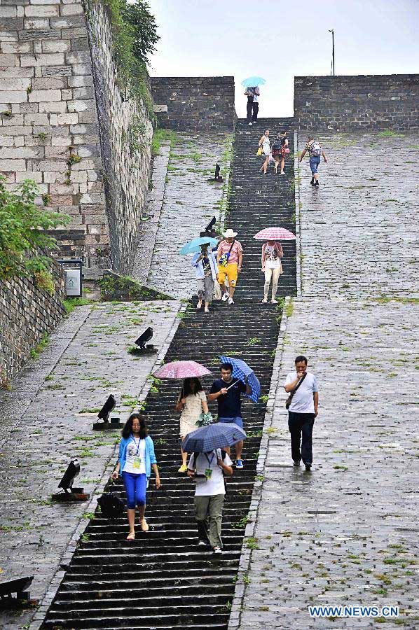 Travelers visit the Zhonghua Gate of the Ming Dynasty city wall on Aug. 13, 2014. The 2nd Summer Youth Olympic Games will kiss off on August 16 in Nanjing, capital of east China's Jiangsu Province. (Xinhua/Yue Yuewei)
