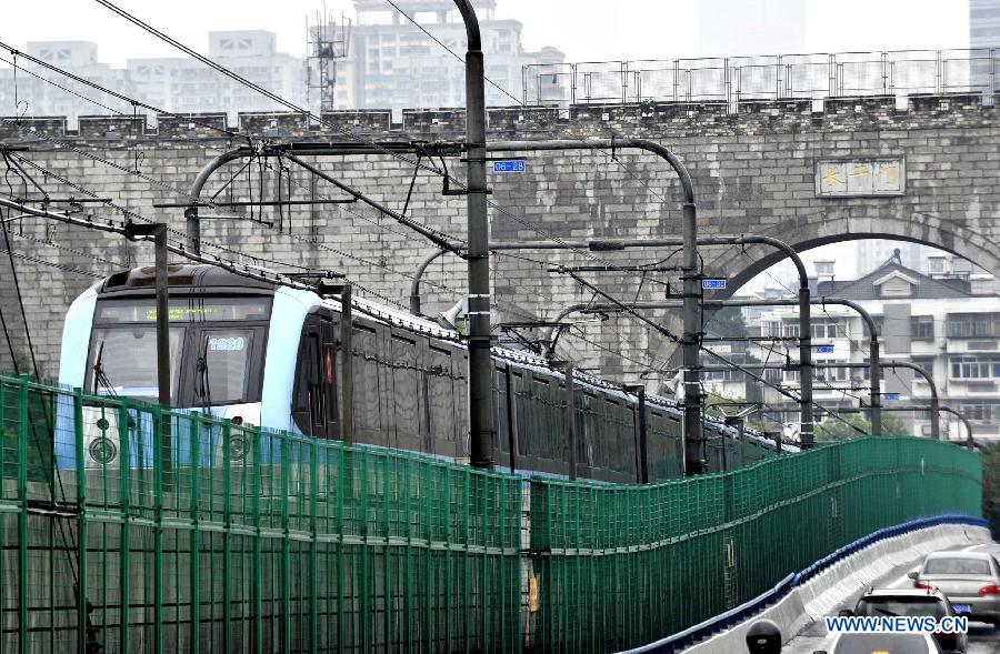 A train runs through the Changgan gate of the Ming Dynasty city wall on Aug. 13, 2014. The 2nd Summer Youth Olympic Games will kiss off on August 16 in Nanjing, capital of east China's Jiangsu Province. (Xinhua/Yue Yuewei)