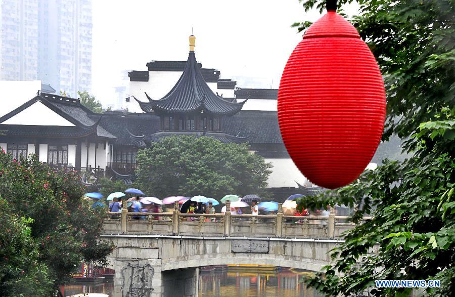 Tourists walk on the bridge of Qinhuai River in Nanjing, capital of east China's Jiangsu Province, on Aug. 13, 2014. The 2nd Summer Youth Olympic Games will be held in Nanjing from August 16 to 28. (Xinhua/Yue Yuewei)