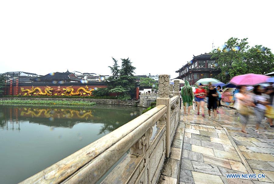 Tourists walk on the bridge of Qinhuai River in Nanjing, capital of east China's Jiangsu Province, on Aug. 13, 2014. The 2nd Summer Youth Olympic Games will be held in Nanjing from August 16 to 28. (Xinhua/Yue Yuewei)