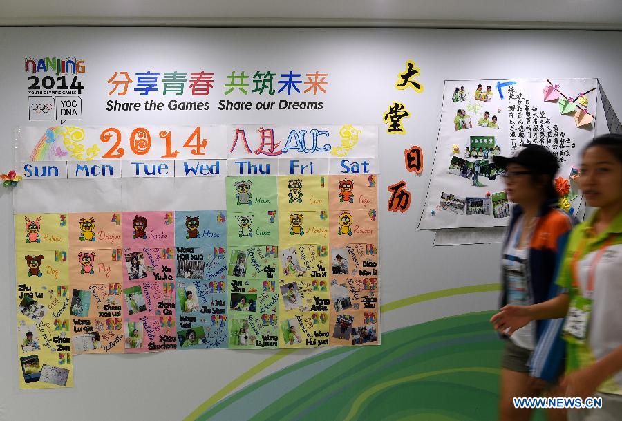 Volunteers of Nanjing 2014 Youth Olympic Games pass by the notice board of the Main Media Centre in Nanjing, capital of east China's Jiangsu province, on Aug. 13, 2014. (Xinhua/Yan Yan)
