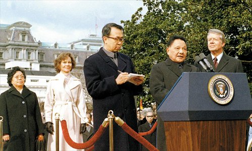 Former Chinese leader Deng Xiaoping delivers a speech during a visit to the US with wife Zhuo Lin (first from left) on January 29, 1979. (Photo/People.cn)