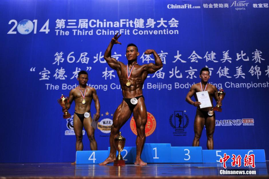 Competitors perform onstage during a bodybuilding competition in Beijing on August 13, 2014. 2014 ChinaFit Convention was held in the China National Convention Center from August 12 to 13. (CNS/Jin Shuo)