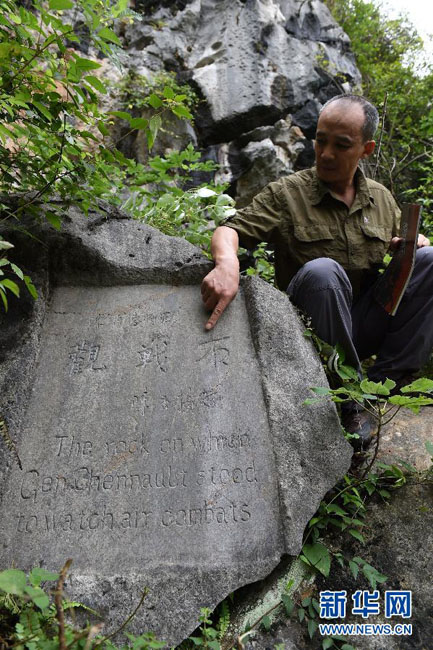 An official with local tourist administration introduces history of the Flying Tigers in front of a stone with calligraphy of Anna Chennault (Chen Xiangmei), the wife of Claire Lee Chennault on Aug. 8, 2014. (Xinhua/Lu Bo'an)