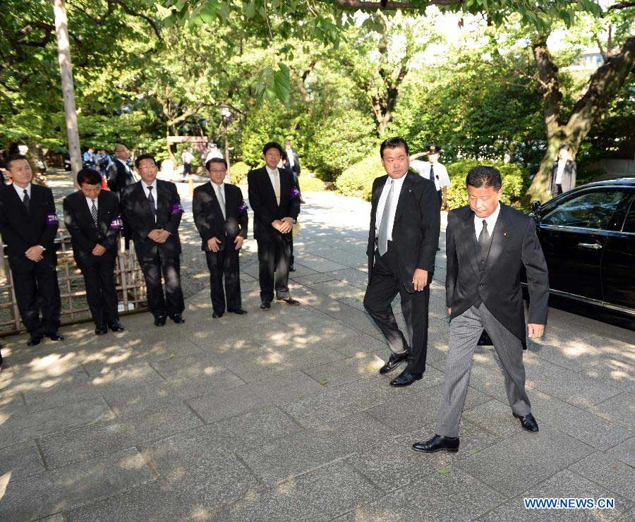 Japanese Internal Affairs Minister Yoshitaka Shindo (1st R) arrives to visit the Yasukuni Shrine in Tokyo, Japan, Aug. 15, 2014. Yoshitaka Shindo visited the controversial war-linked Yasukuni Shrine on Friday on the 69th anniversary of Japan's surrender in the World War II. (Xinhua/Ma Ping)