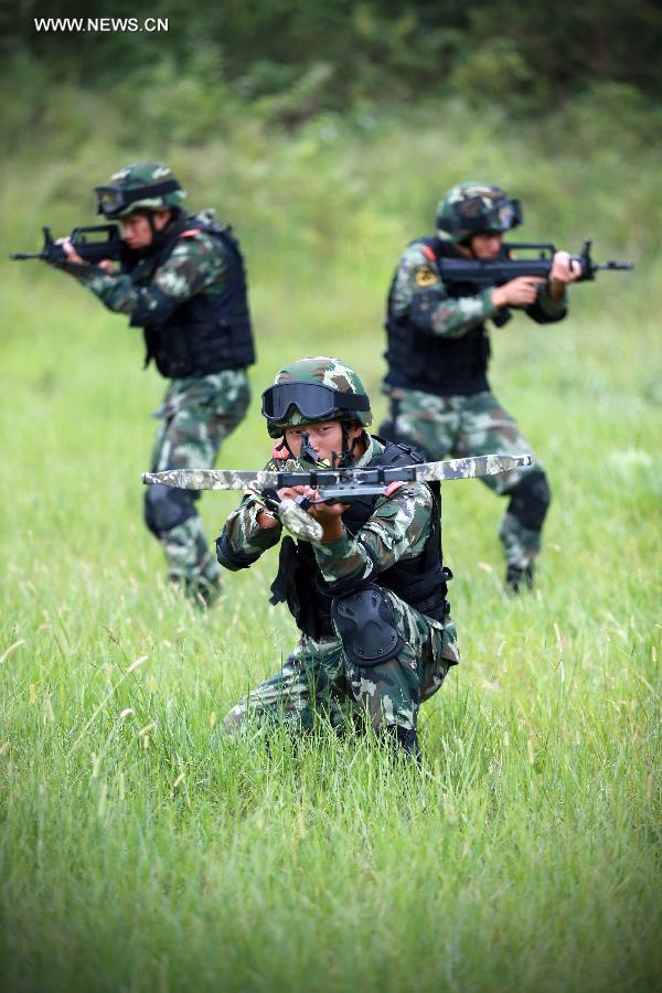 Armed policemen of Cobra Storm Troops take part in a drill in Guilin, south China's Guangxi Zhuang Autonomous Region, Aug. 14, 2014. (Xinhua/Liu Jiaoqing)