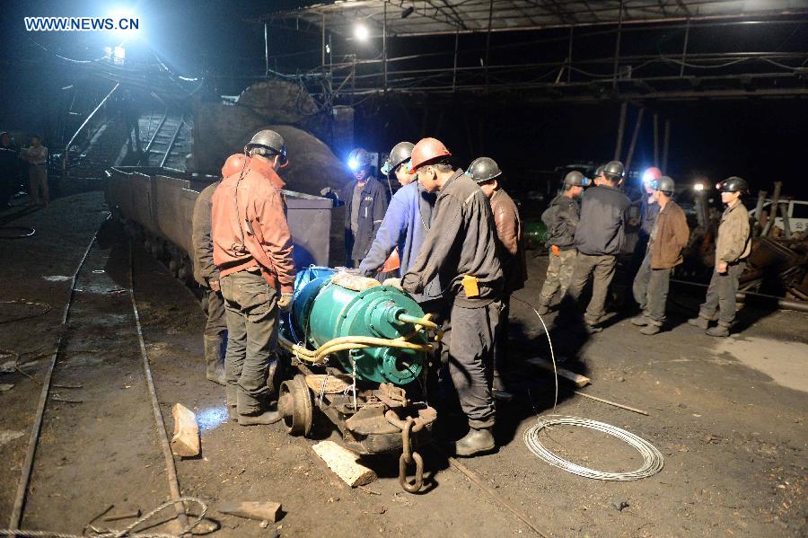 Rescuers try to put a pump into the flooded well of the Anzhishun Coal Mine at the Chengzihe district of Jixi,in northeast China's Heilongjiang Province, early on Aug. 15, 2014. Twenty-three people have been trapped after the coal mine was flooded in Jixi City on Aug. 14. (Xinhua/Wang Kai) |