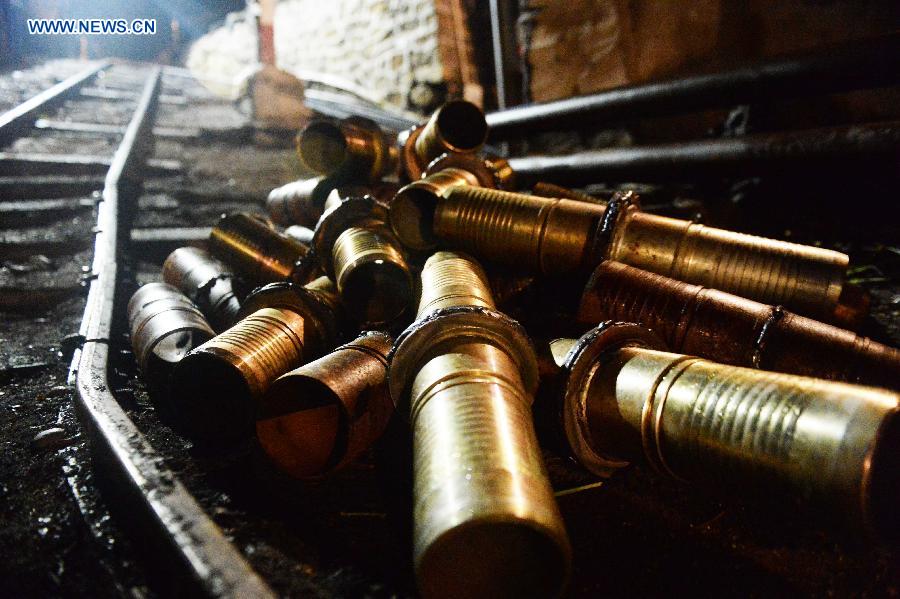 Pumping tubes are transported to entrance of the flooded well of the Anzhishun Coal Mine at the Chengzihe district of Jixi,in northeast China's Heilongjiang Province, early on Aug. 15, 2014. Twenty-three people have been trapped after the coal mine was flooded in Jixi City on Aug. 14. (Xinhua/Wang Kai)