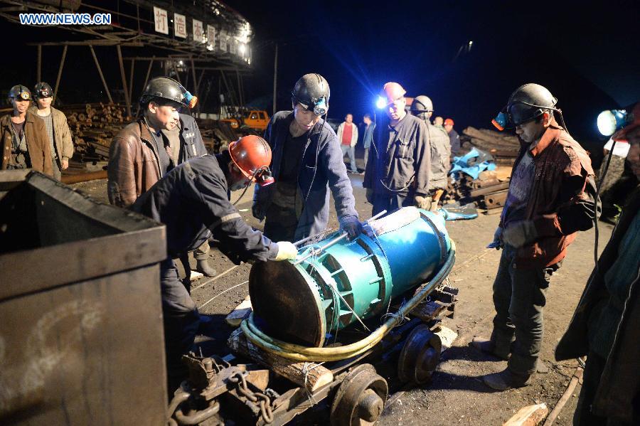 Rescuers try to put a pump into the flooded well of the Anzhishun Coal Mine at the Chengzihe district of Jixi,in northeast China's Heilongjiang Province, early on Aug. 15, 2014. Twenty-three people have been trapped after the coal mine was flooded in Jixi City on Aug. 14. (Xinhua/Wang Kai)