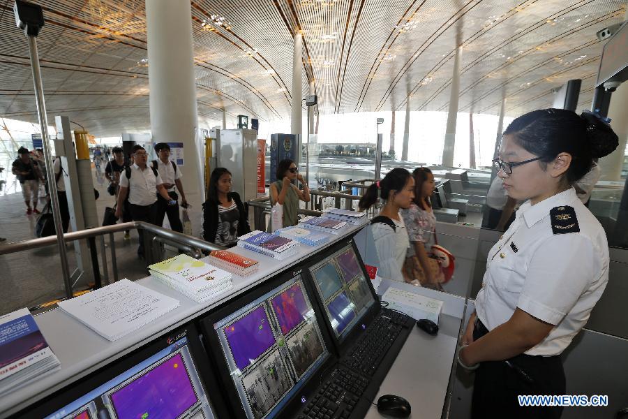 A quarantine staff member monitors body temperatures of passengers who pass infrared thermometry machine at Beijing Capital International Airport in Beijing, capital of China, Aug. 14, 2014. To prevent the deadly Ebola virus from entering China, China's quarantine authority implements stricter inspections on inbound flights from regions affected by Ebola and step up sanitary measures on incoming goods. (Xinhua/Shen Bohan)