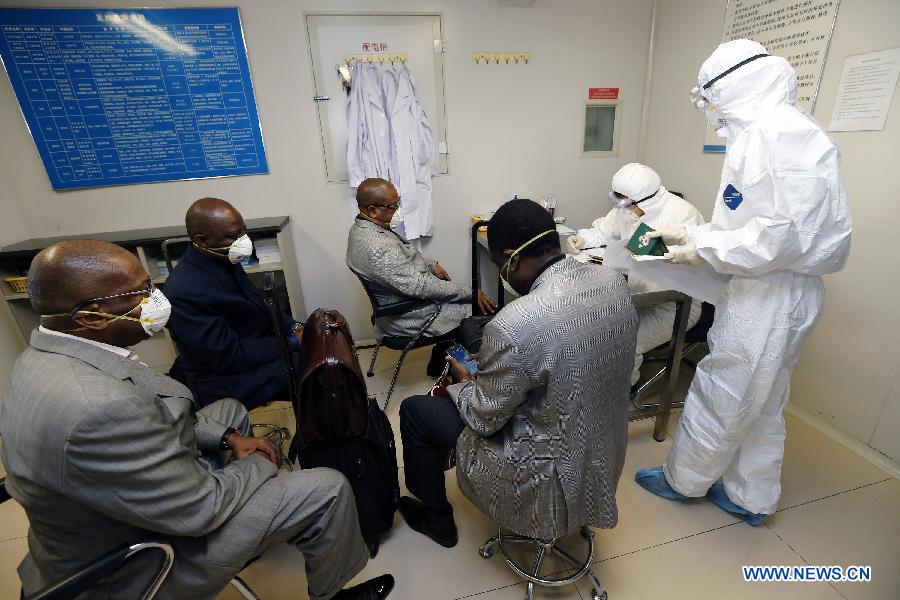 Quarantine staff members fill up questionary for four passengers who came from Ebola-infected Nigeria at the Beijing Capital International Airport in Beijing, capital of China, Aug. 14, 2014. To prevent the deadly Ebola virus from entering China, China's quarantine authority implements stricter inspections on inbound flights from regions affected by Ebola and step up sanitary measures on incoming goods. (Xinhua/Shen Bohan) |