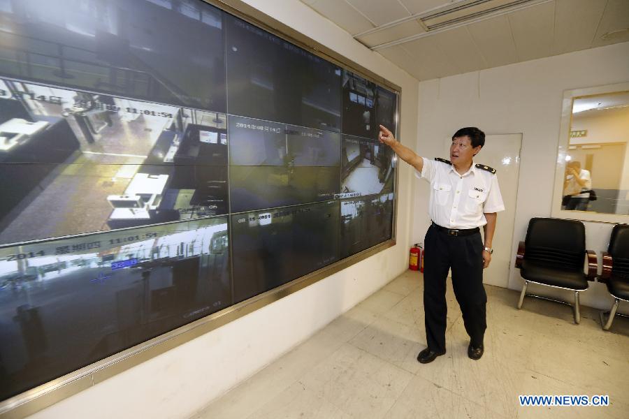 Quarantine officer Gao Jun introduces monitors which are able to show infrared temperatures of passengers who walk past checkpoints of the T2 and T3 terminals at the Beijing Capital International Airport in Beijing, capital of China, Aug. 14, 2014. To prevent the deadly Ebola virus from entering China, China's quarantine authority implements stricter inspections on inbound flights from regions affected by Ebola and step up sanitary measures on incoming goods. (Xinhua/Shen Bohan) |