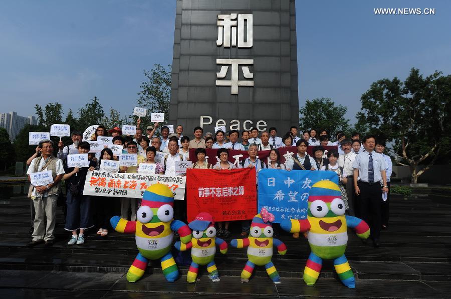 People pose for a group photo during an assembly to mourn for victims in the Nanjing Massacre at the Memorial Hall of the Victims in Nanjing Massacre by Japanese Invaders in Nanjing, capital of east China's Jiangsu Province, Aug. 15, 2014. Friday marked the 69th anniversary of Japan's unconditional surrender at the end of world War II. (Xinhua/Han Yuqing) |