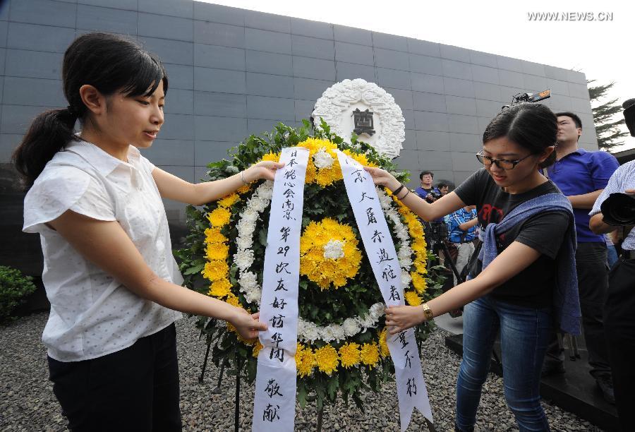 Delegates from Japan present a wreath to victims of the Nanjing Massacre during an assembly at the Memorial Hall of the Victims in Nanjing Massacre by Japanese Invaders in Nanjing, capital of east China's Jiangsu Province, Aug. 15, 2014. Friday marked the 69th anniversary of Japan's unconditional surrender at the end of world War II. (Xinhua/Sun Can) |