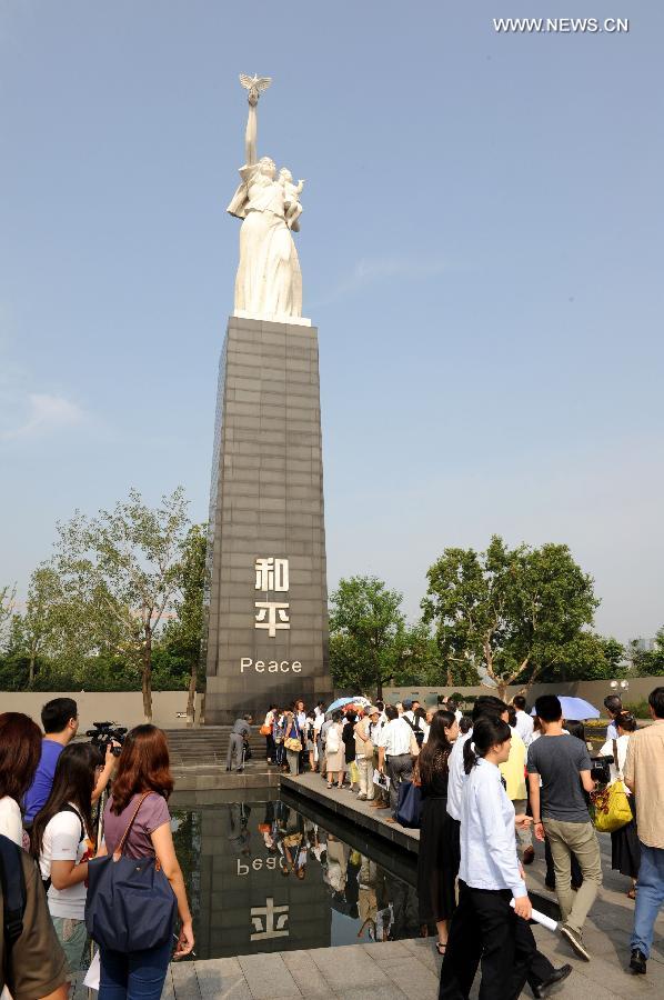 People attend an assembly to mourn for victims in the Nanjing Massacre at the Memorial Hall of the Victims in Nanjing Massacre by Japanese Invaders in Nanjing, capital of east China's Jiangsu Province, Aug. 15, 2014. Friday marked the 69th anniversary of Japan's unconditional surrender at the end of world War II. (Xinhua/Sun Can) |