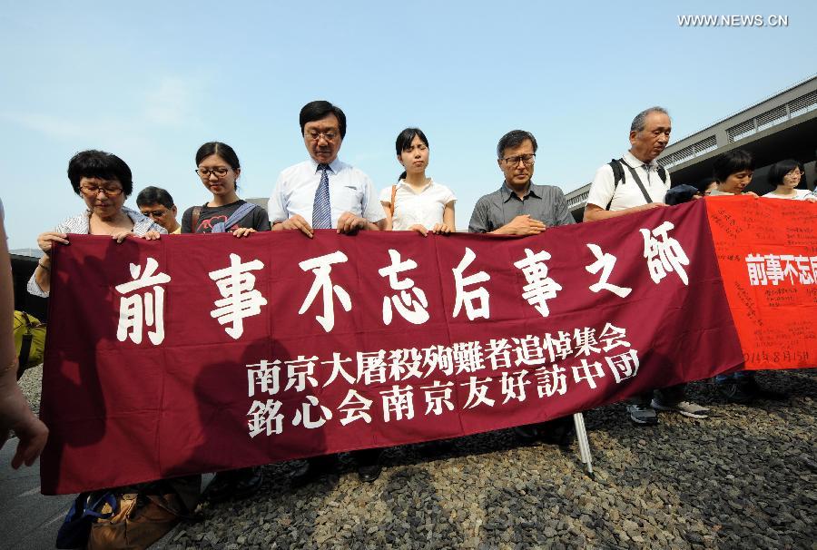 Zhu Chengshan (3rd L, front), curator of the Memorial Hall of the Victims in Nanjing Massacre by Japanese Invaders, mourns for victims of the Nanjing Massarce with Japanese delegates during an assembly in Nanjing, capital of east China's Jiangsu Province, Aug. 15, 2014. Friday marked the 69th anniversary of Japan's unconditional surrender at the end of world War II. (Xinhua/Sun Can) |