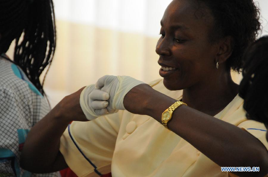 A Sierra Leone medical worker participates in a training with members of Chinese medical expert team in Freetown, Sierra Leone, Aug. 14, 2014. China has sent three expert teams and medical supplies to Guinea, Liberia and Sierra Leone to assist in the prevention and control of the Ebola virus. (Xinhua/Lin Xiaowei) |
