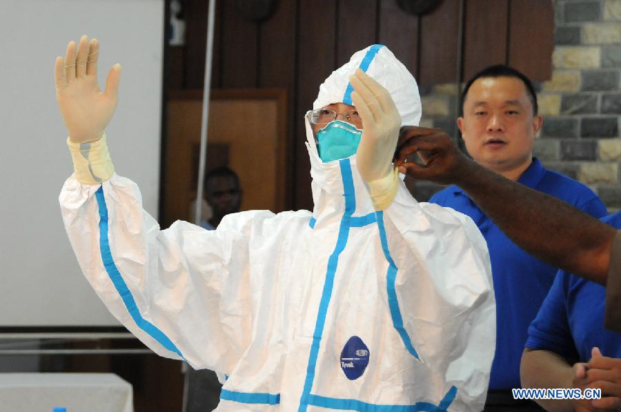 Members of Chinese medical expert team demonstrate during a training with Sierra Leone medical workers in Freetown, Sierra Leone, Aug. 14, 2014. China has sent three expert teams and medical supplies to Guinea, Liberia and Sierra Leone to assist in the prevention and control of the Ebola virus. (Xinhua/Lin Xiaowei) |