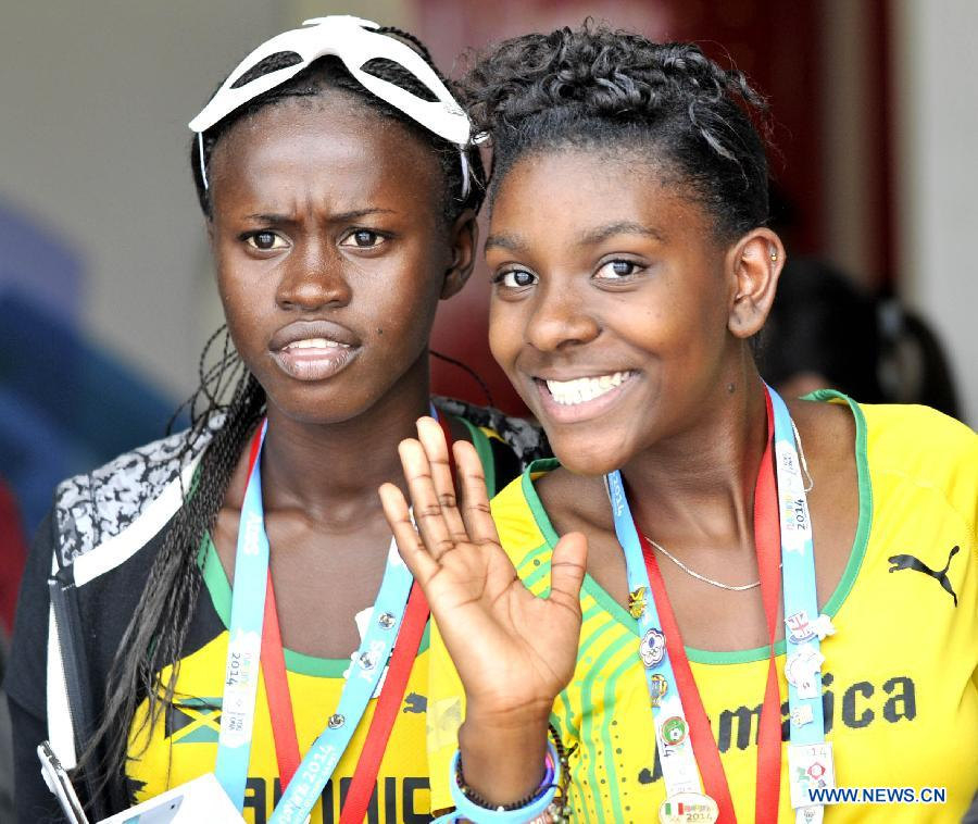 Shenice Cohen(R) and her teammate of Jamaica pose for a photo in the Youth Olympic Village of Nanjing 2014 Youth Olympic Games in Nanjing, east China's Jiangsu Province, August 15, 2014. (Xinhua/Yue Yuewei)