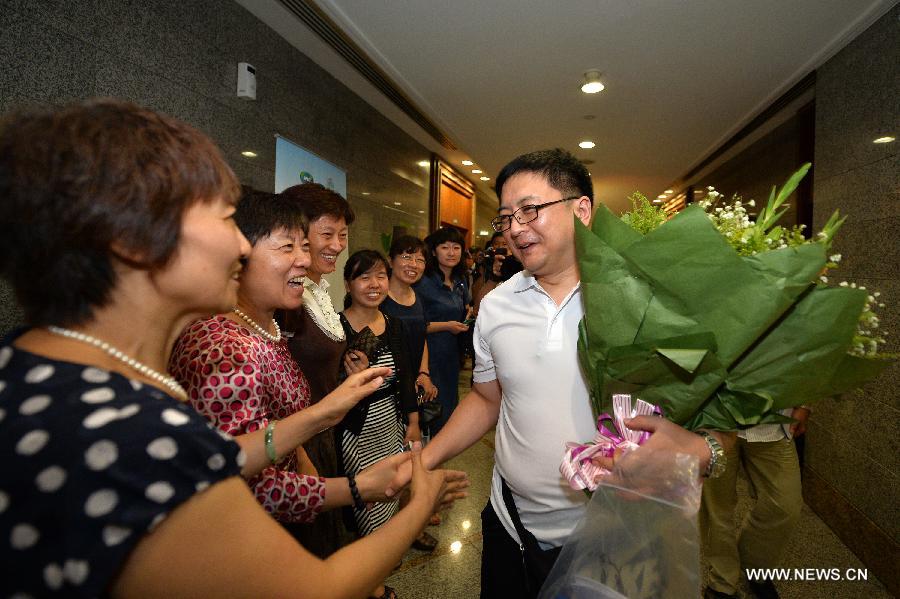Li Xin (1st R), an expert on infectious disease of Ditan Hospital bids farewell to his relatives and colleagues before departure at the Beijing Capital International Airport, Beijing, China, Aug. 15, 2014. The 24th Chinese medical team from the Beijing Friendship Hospital left for the Ebola-affected Guinea for a two-year aid mission on early Saturday. Besides, three public health experts from the disease prevention and control center, Ditan Hospital and Peking Union Medical College Hospital were also on the flight. (Xinhua/Li Xin)