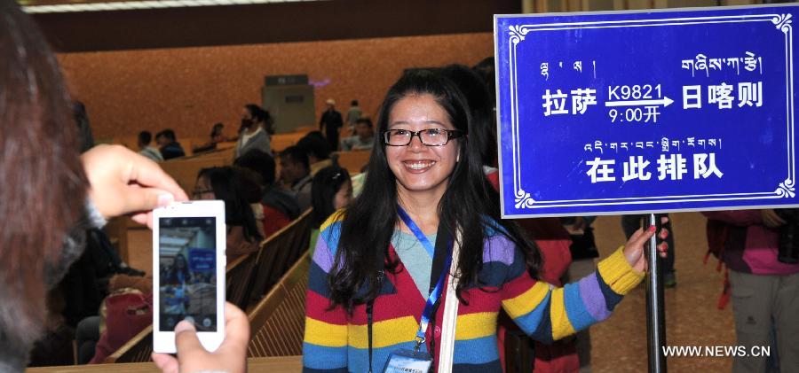 A passenger to take the train from Lhasa to Xigaze poses for photo as she wait for boarding the train at Lhasa Railway Station in Lhasa, capital of southwest China's Tibet Autonomous Region, Aug. 16, 2014. A second railway line in southwest China's Tibet Autonomous Region, which is 251 kilometers long and links the regional capital Lhasa and Xigaze, the second-largest city in the region, was officially put into use. (Xinhua/Soinam Norbu) |