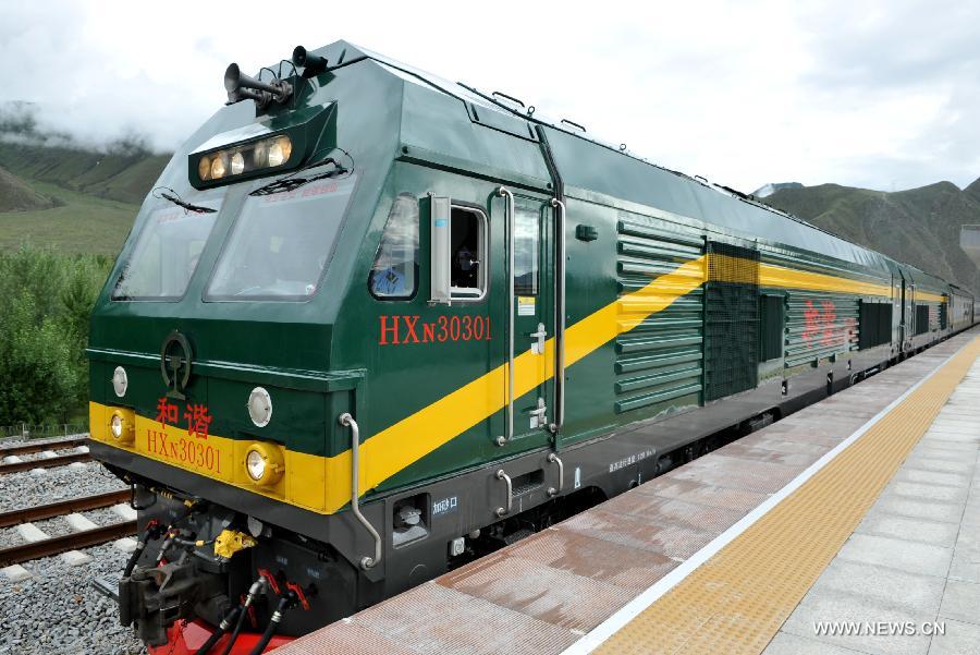 The first passenger train from Lhasa to Xigaze sets out from Quxu Railway Station in Lhasa, capital of southwest China's Tibet Autonomous Region, Aug. 16, 2014. A second railway line in southwest China's Tibet Autonomous Region, which is 251 kilometers long and links the regional capital Lhasa and Xigaze, the second-largest city in the region, was officially put into use. (Xinhua/Soinam Norbu) |