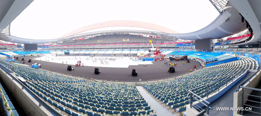 Photo taken on August 16, 2014 shows the rehearsal of Youth Olympic Games (YOG) in Nanjing Olympic Sports Center. The opening ceremony of YOG will start at 8:00 pm on August 16, 2014. (Xinhuanet/Wang Hanlin)
