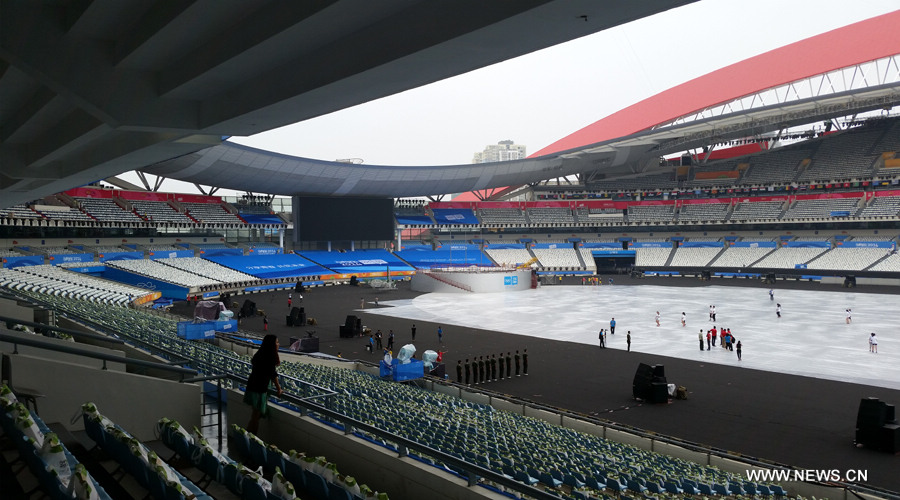 Photo taken on August 16, 2014 shows the rehearsal of Youth Olympic Games (YOG) in Nanjing Olympic Sports Center. The opening ceremony of YOG will start at 8:00 pm on August 16, 2014. (Xinhuanet/Wang Hanlin)