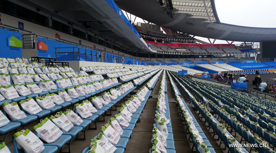 Photo taken on August 16, 2014 shows the media seats for the opening ceremony of YOG in Nanjing Olympic Sports Center. The opening ceremony of YOG will start at 8:00 pm on August 16, 2014. (Xinhuanet/Wang Hanlin)