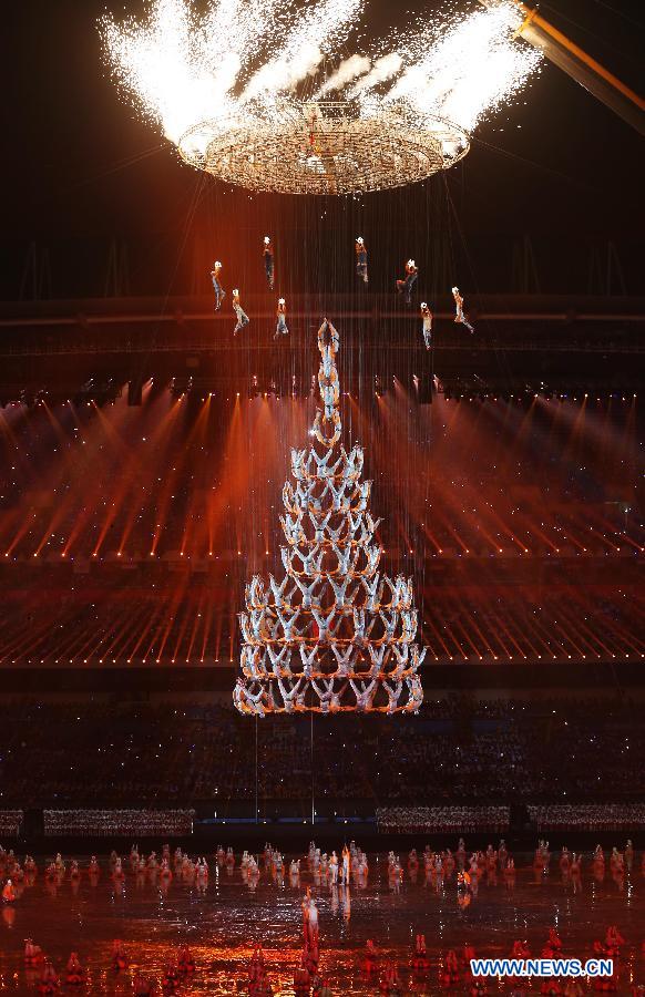 Performers from Songshan Shaolin Tagou Martial Arts School at Dengfeng, Henan Province perform aerial stunts during the opening ceremony of Nanjing 2014 Youth Olympic Games in Nanjing, capital of east China’s Jiangsu Province, Aug. 16, 2014. (Xinhua/Yang Lei)