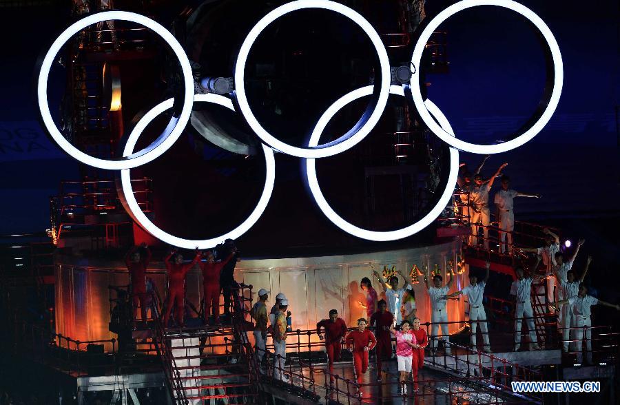 | Chinese diver Chen Ruolin(front) runs with the torch during the opening ceremony of Nanjing 2014 Youth Olympic Games in Nanjing, capital of east China’s Jiangsu Province, Aug. 16, 2014. (Xinhua/Zhao Peng) |