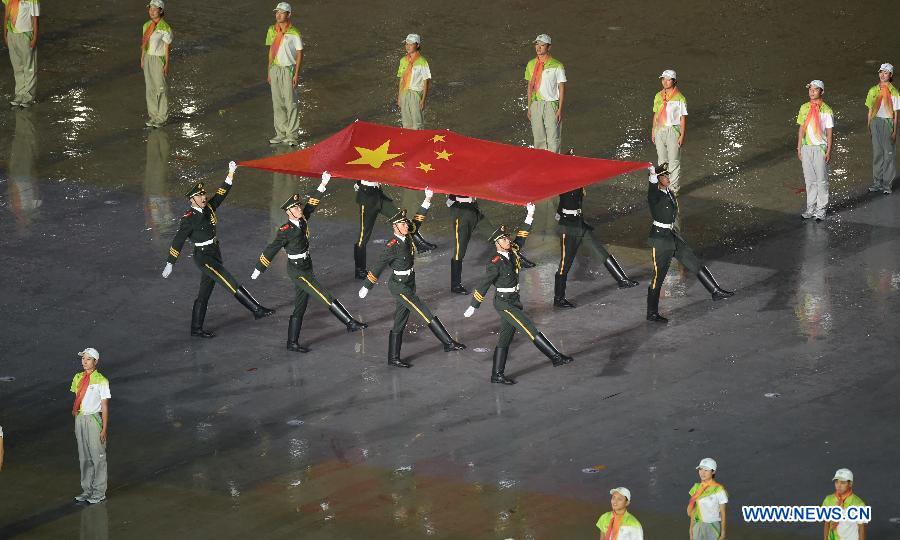Eight flag bearers from the honour guard escort the national flag of the People's Republic of China into the stadium during the opening ceremony for Nanjing 2014 Summer Youth Olympic Games in Nanjing, capital of east China's Jiangsu Province, Aug. 16, 2014. (Xinhua/Guo Yong)