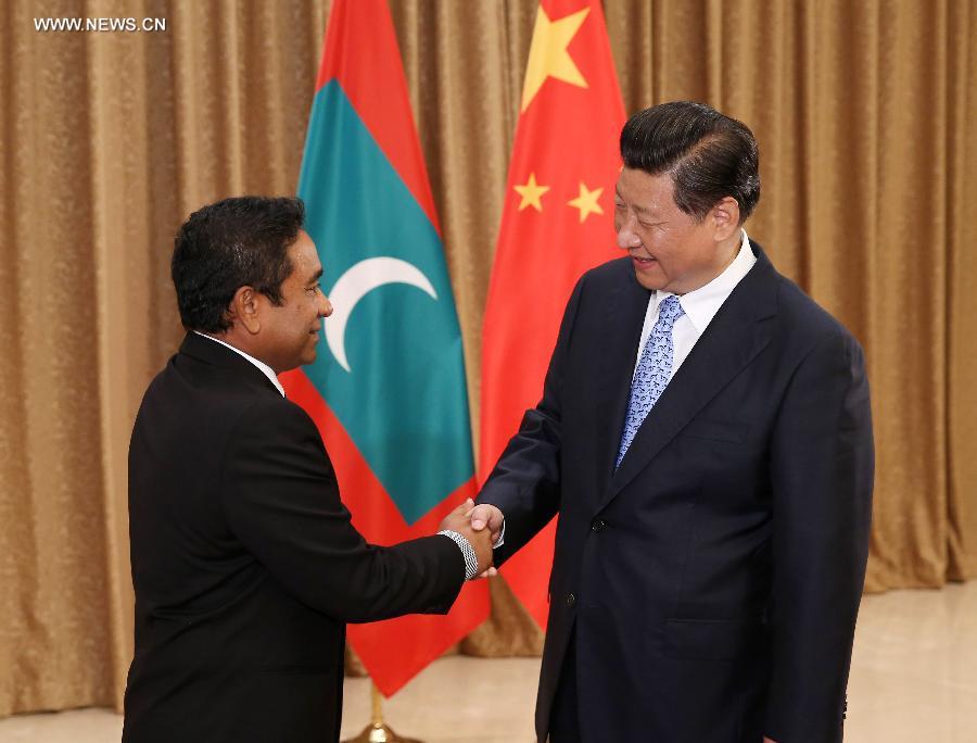 Chinese President Xi Jinping (R) meets with President of the Maldives Abdulla Yameen in Nanjing, capital of east China's Jiangsu Province, Aug. 16, 2014. (Xinhua/Pang Xinglei)