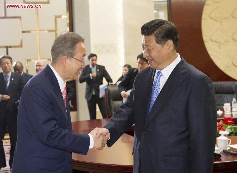 Chinese President Xi Jinping (R) meets with UN Secretary-General Ban Ki-moon in Nanjing, capital of east China's Jiangsu Province, Aug. 16, 2014. (Xinhua/Xie Huanchi)