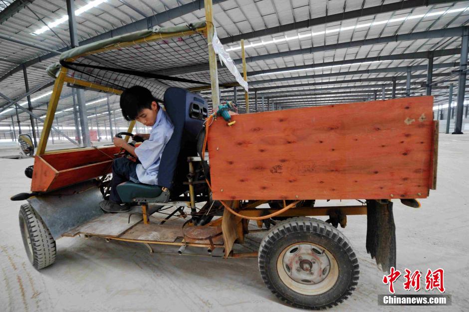 The worker drives his unique "car". (Chinanews/Zhang Bin)