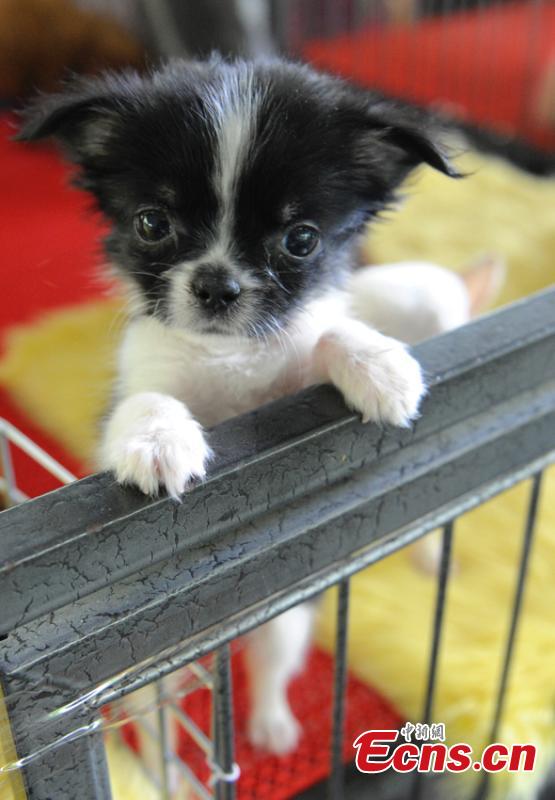 A dog is seen at the 13th Changchun International Agricultural Products Trade Fair in Changchun city of northeast China's Jilin province on Aug. 18, 2014. [Photo/Zhang Yao]